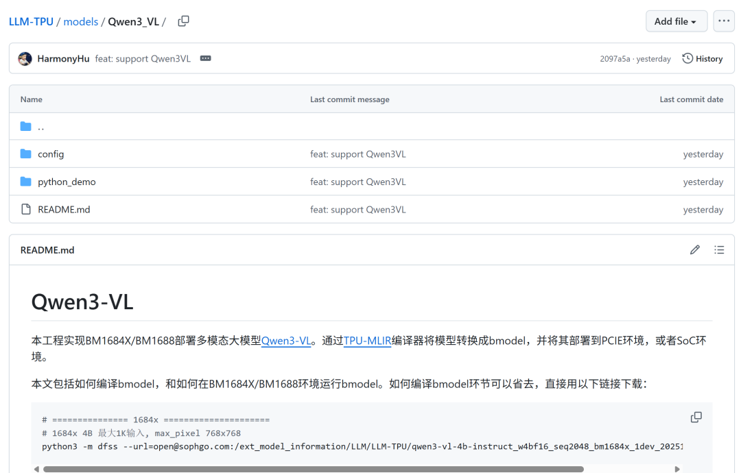 BM1684X芯片已完成对Qwen3-VL系列的适配工作,并开源在LLM-TPU仓库,所有基于BM1684X的盒子、计算卡、微服务器都可以稳定运行。