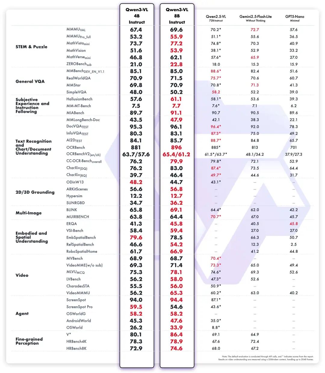 Qwen3-VL 4B和8B模型在保持模型轻量化的同时,确保了多模态理解能力的完整性。这两个规模的模型均提供Instruct和Thinking两个版本,满足不同场景的应用需求。